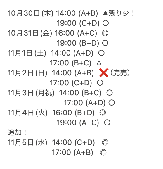 #劇団二畳 #あの日は江古田で君と 本日10/19時点の残席状況です。 ▲は残り10席未満という感じです。 初日は近日完売しそう💦 ご予約お待ちしております! ご予約 ticket.corich.jp/apply/400023/