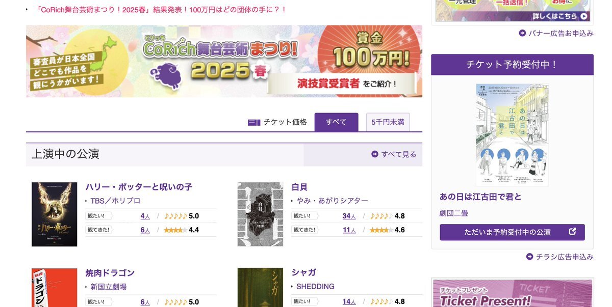 パソコンからだとこんな感じでTOPページの右側に表示さてます。stage.corich.jp いくつかの団体さんの案内がランダムで表示されるので何度かリロードすると表示見れると思います。 #劇団二畳 #あの日は江古田で君と #こりっち舞台芸術 pic.x.com/ulsNx5GfRD x.com/2Theater/statu…