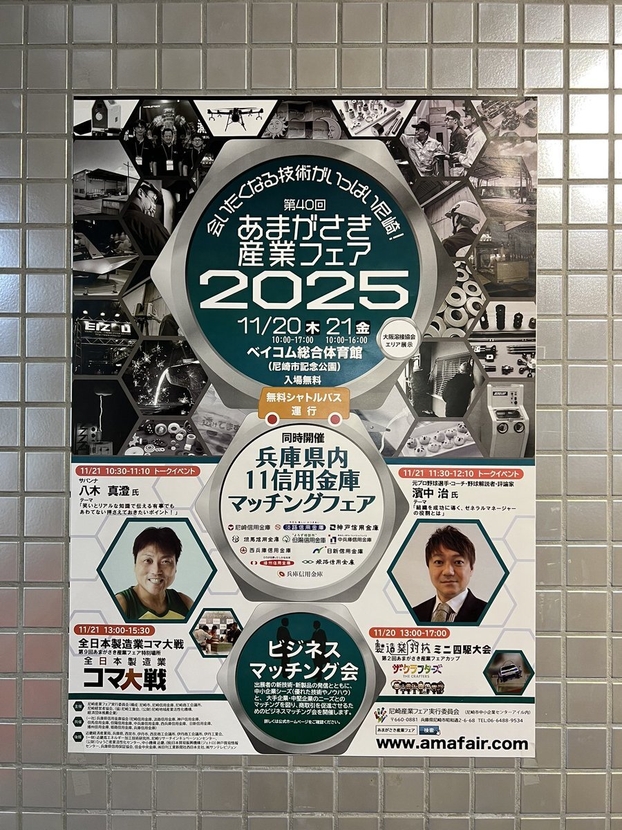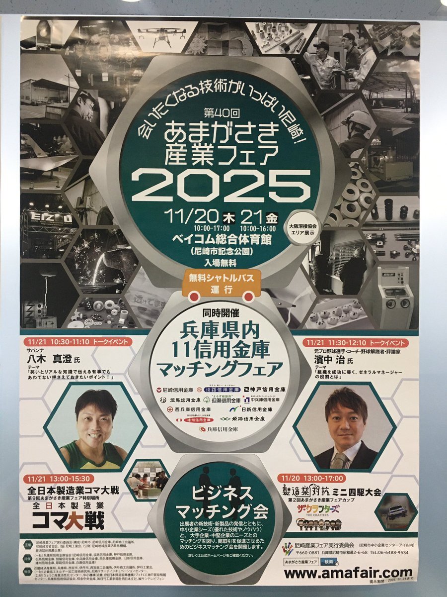 ついに今週は #あまがさき産業フェア2025 🎊 ☀️会期☀️ 2025年11月20(木)10:00〜17:00       21(金)10:00〜16:00 ☀️会場☀️ ベイコム総合体育館 ☀️入場料☀️ 無料 さらに! 21日はお笑いタレント #サバンナ #八木真澄 氏が、 22日は元プロ野球選手 #濱中治 氏のトーイベントがあります😆