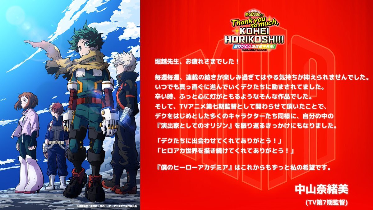 ◤ #ありがとう堀越耕平先生 ◢ 『僕のヒーローアカデミア』 TVアニメ7期 中山奈緒美監督から 堀越先生へメッセージ 他スタッフ・キャストからのメッセージ アニメーターからのイラストはこちら ▶heroaca.com/thank_you_hori… #heroaca_a #次は僕たちだ pic.x.com/O8ZJfjKCiB