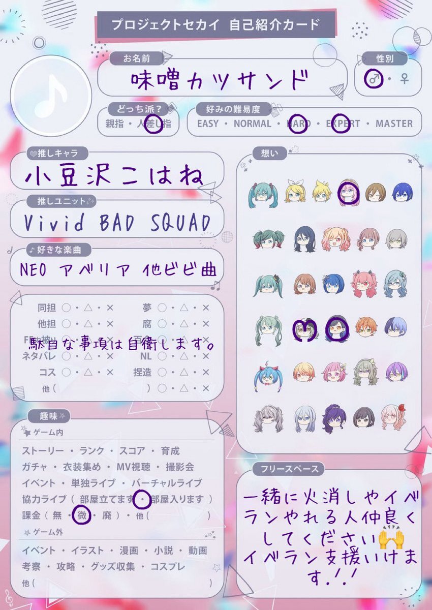 出戻り勢です.ᐟ.ᐟ イベランや火消し一緒にやれるお友達が欲しいです🥺 discord鯖参加可能です✨ 詳しく➡️ lit.link/3s0ka2(必読ではないです) #プロセカ #プロセカ自己紹介カード #プロセカ履歴書 #プロセカ好きと繋がりたい #いいねかRTで気になった人フォローする