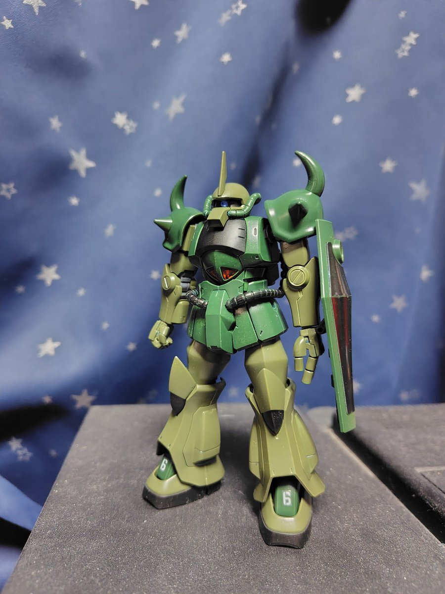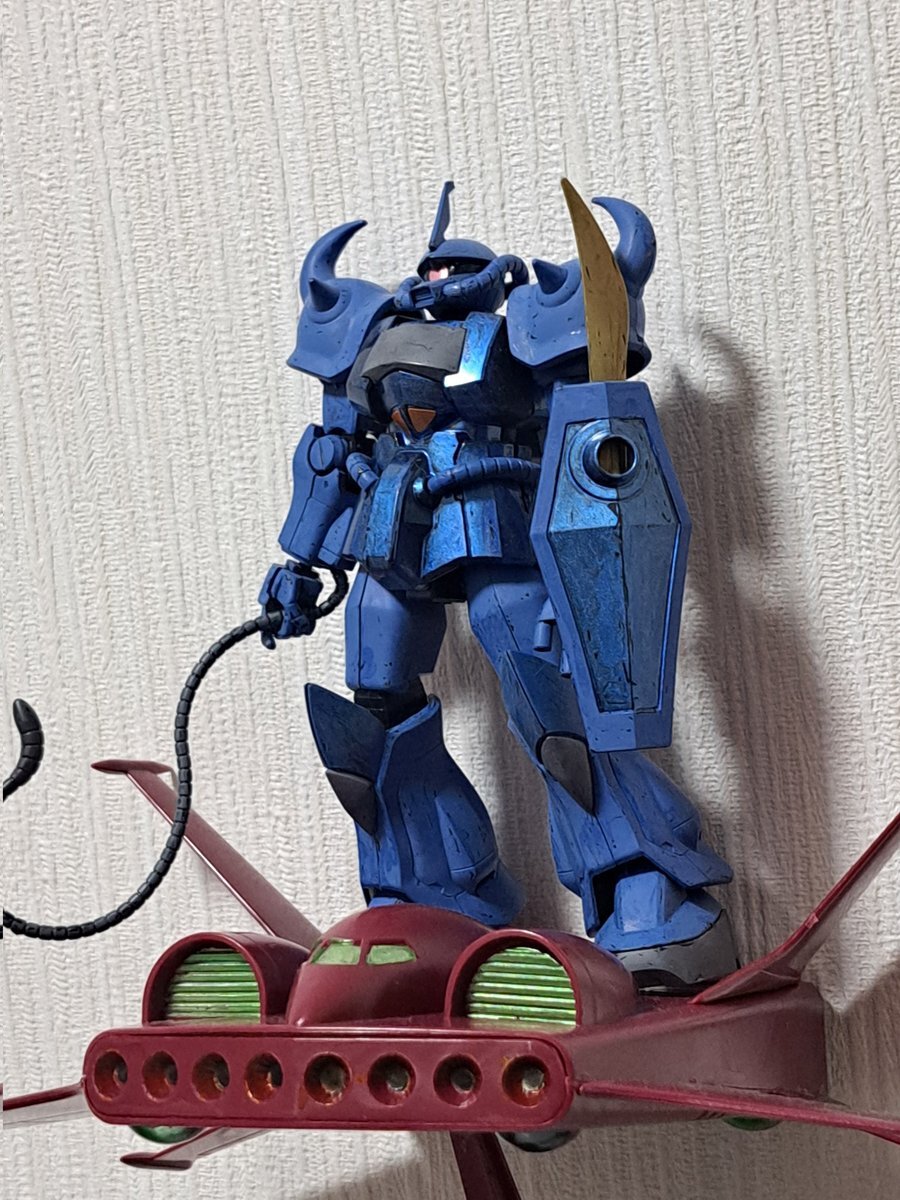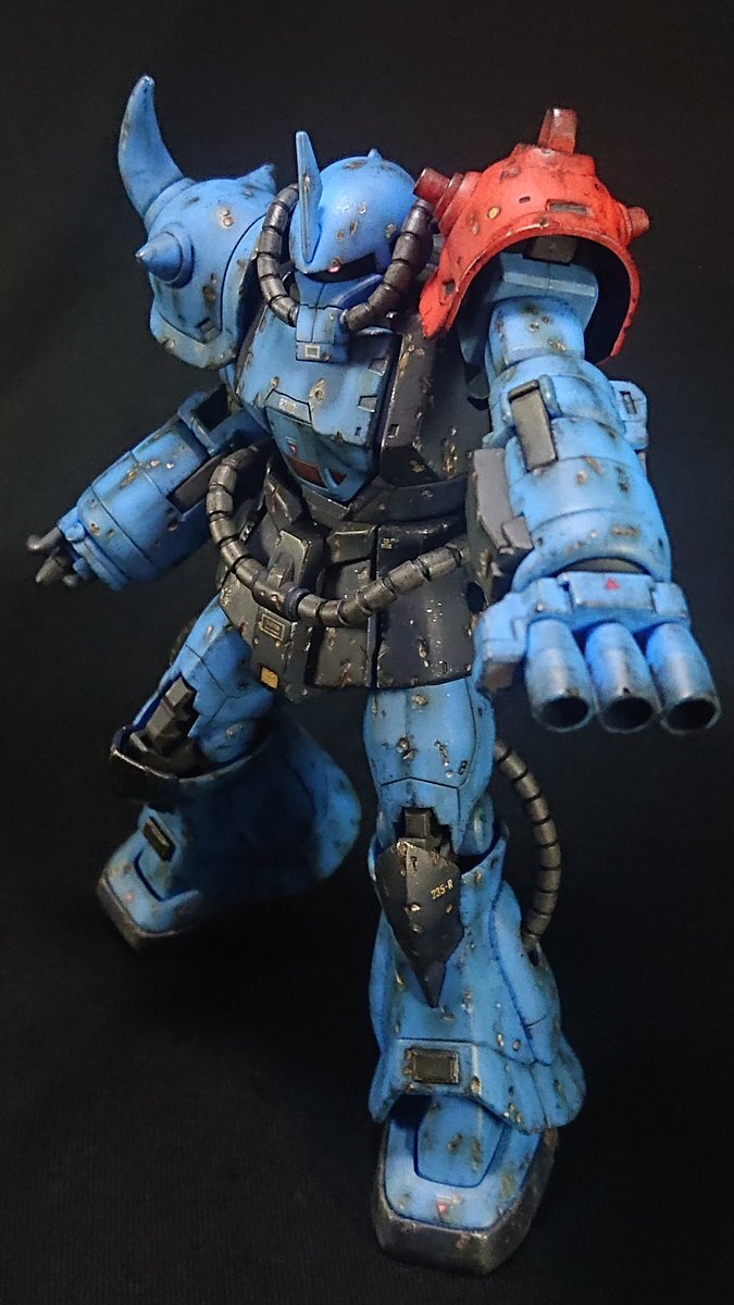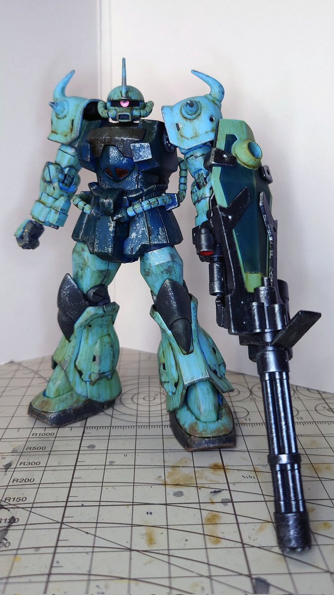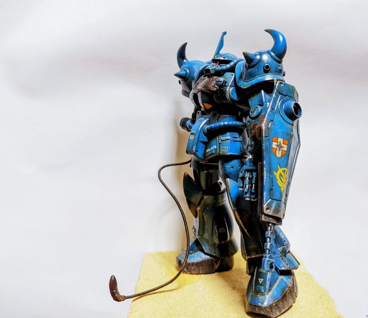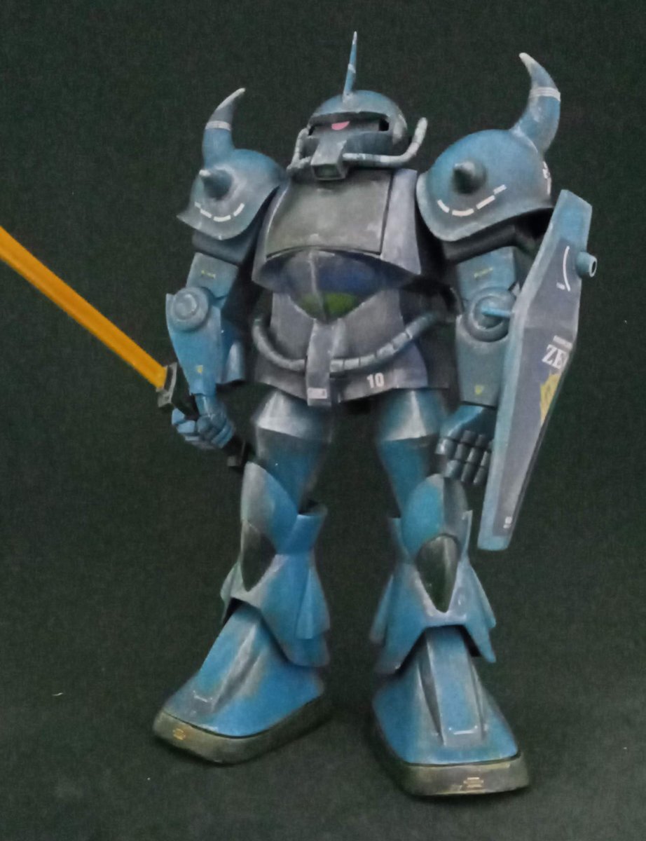 遅刻したけど... グフでウェザリングの練習させてもらったなぁ(´ᴗ ·̫ ᴗ`) この子ツノも、盾も、モノアイもついて丸みあるから、色々やってみるのにめっちゃよかった。 #いいグフの日 pic.x.com/e7TRa6uDRI