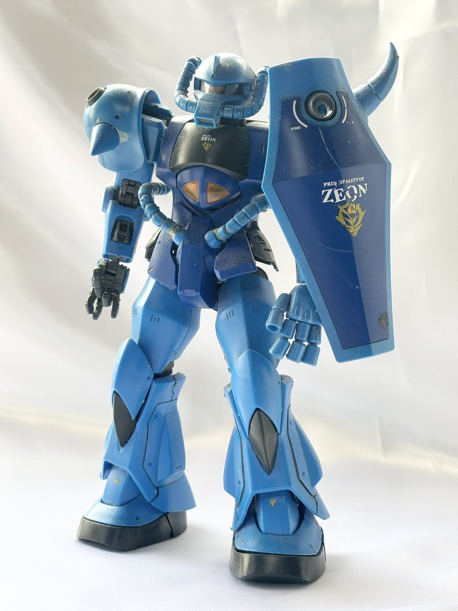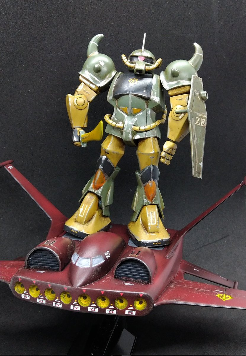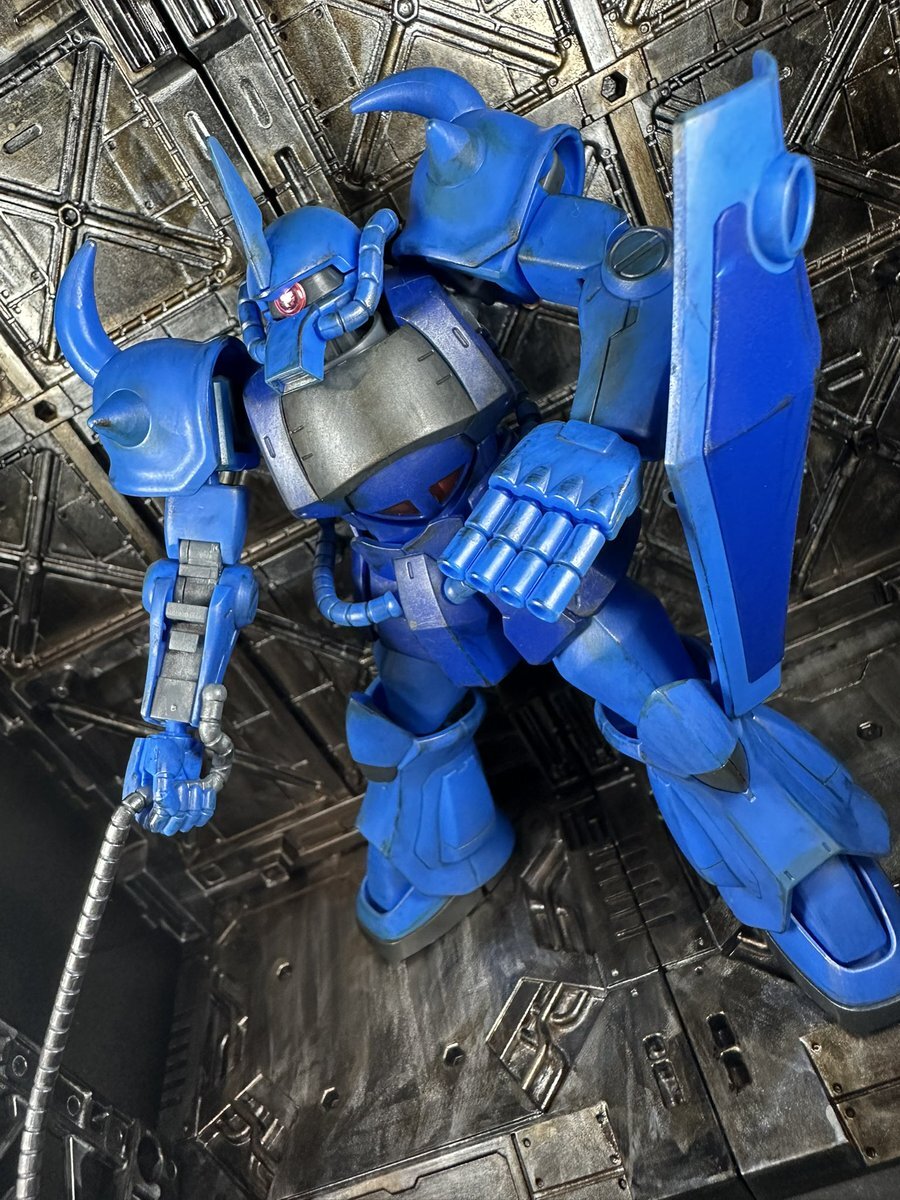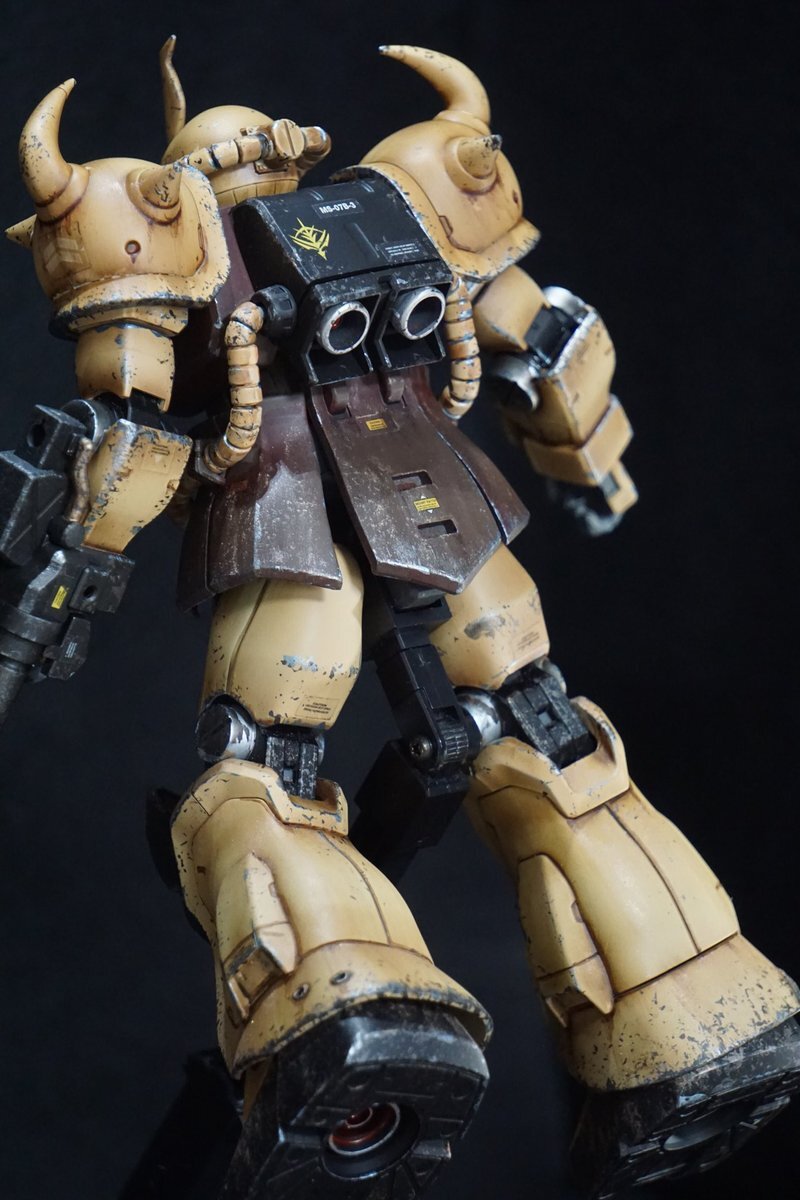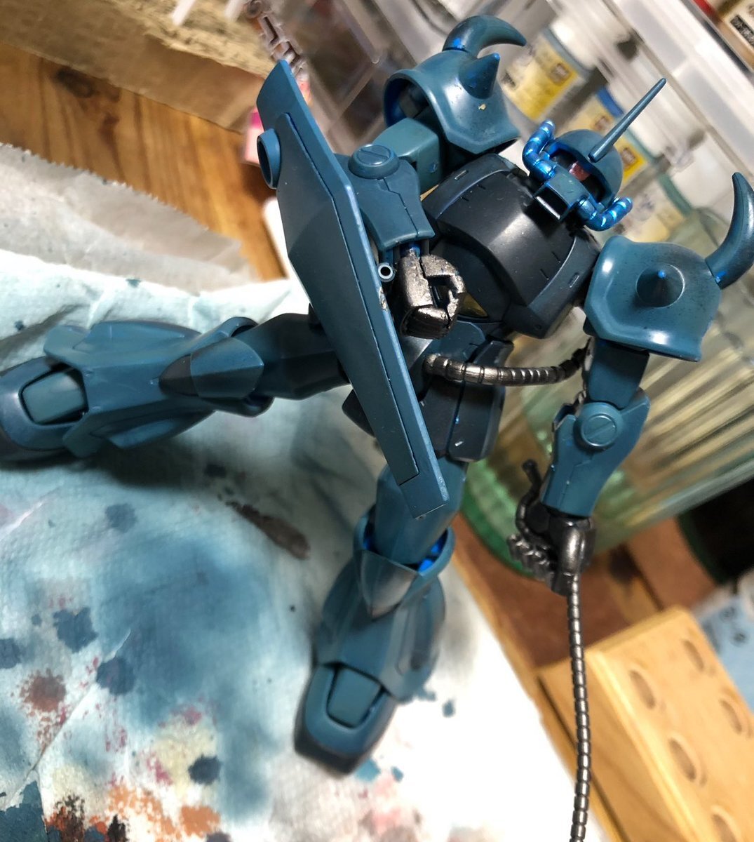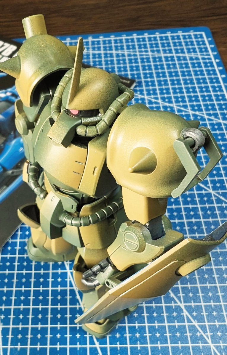遅刻したけど... グフでウェザリングの練習させてもらったなぁ(´ᴗ ·̫ ᴗ`) この子ツノも、盾も、モノアイもついて丸みあるから、色々やってみるのにめっちゃよかった。 #いいグフの日 pic.x.com/e7TRa6uDRI