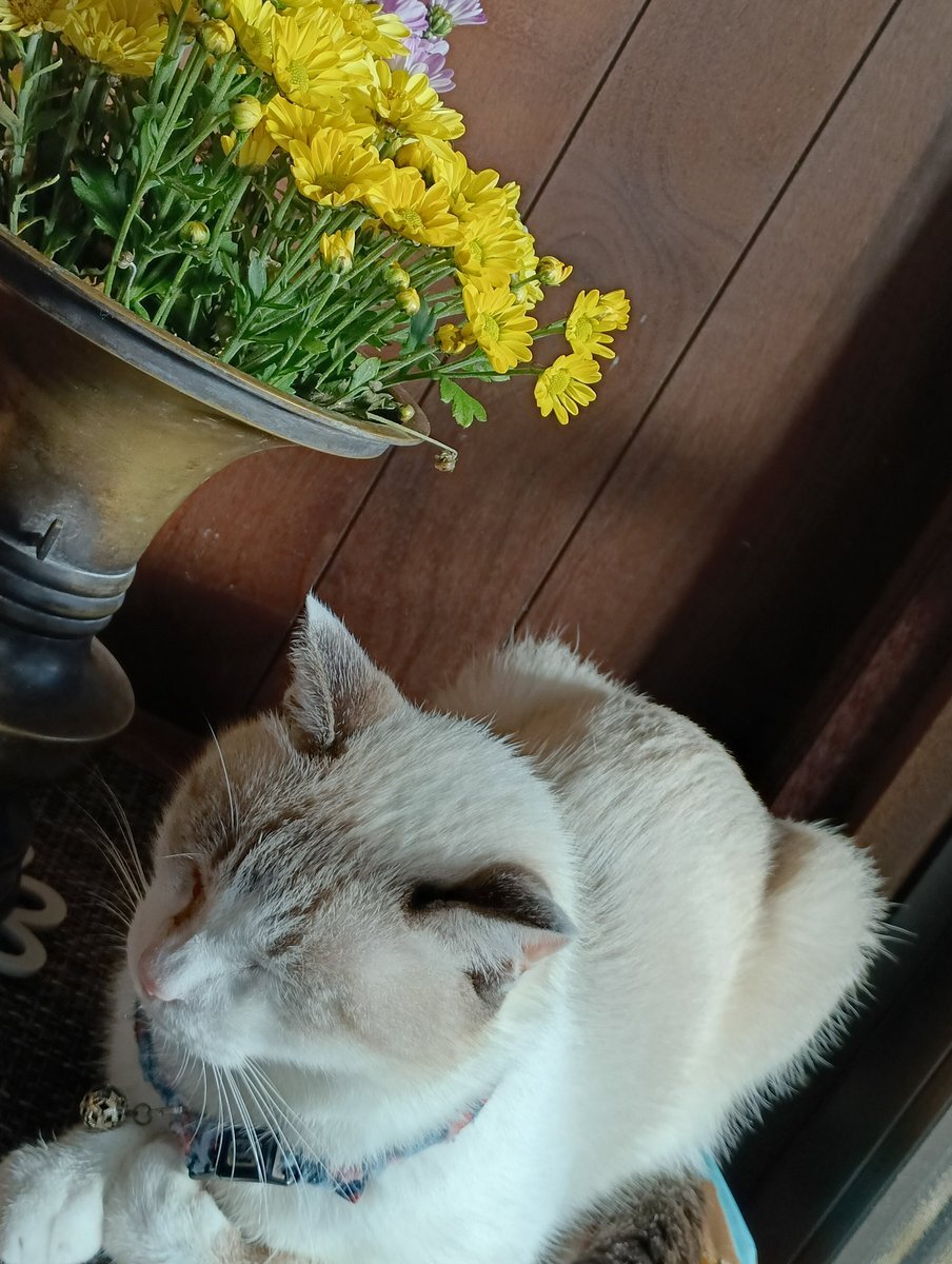 今日の午後の光景。シャムトラが小菊の隣で昼寝をする光景🐈 今日(11月6日)は、#いいマムの日 だそうだ。 菊の学名の「Chrysanthemum(クリサンセマム)」に因んだ、とか。 #TLを花でいっぱいにしよう #猫 #ねこかわいいね pic.x.com/sNcydu6AMH