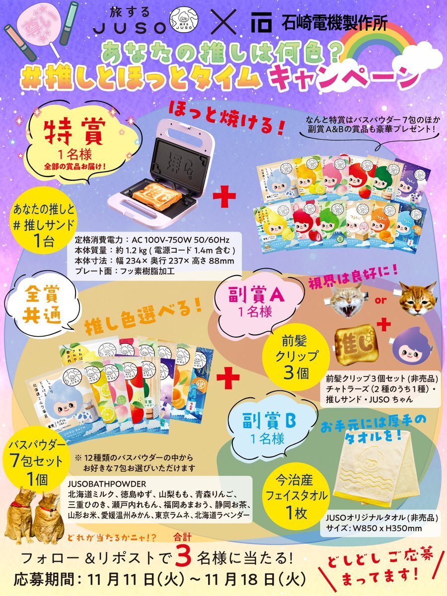 相互フォロワー企業様  キャンペーン応援!! 🌈✨ #いい出会いの日 ✨🌈  \旅するJUSO×石崎電機製作所コラボ/ 💖推しとほっとタイム プレゼントキャンペーン 💖    豪華賞品が合計3名様に当たる👀✨ 応募詳細は  こちらから⇓⇓ x.com/sure_ishizaki/…