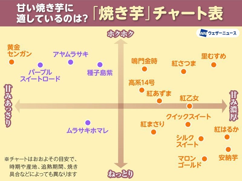 <自分好みが見つかる焼き芋チャート> 今日11月13日は #いい焼き芋の日。食感や甘みは収穫時期や産地、焼き具合以上に"種類"が一番大きく関係するそう。 ホクホク派は「紅あずま」や「高系14号」が代表、ねっとり派は「紅はるか」や「安納芋」が人気だそうです。 weathernews.jp/news/202511/12… pic.x.com/qEjE5gxKUL