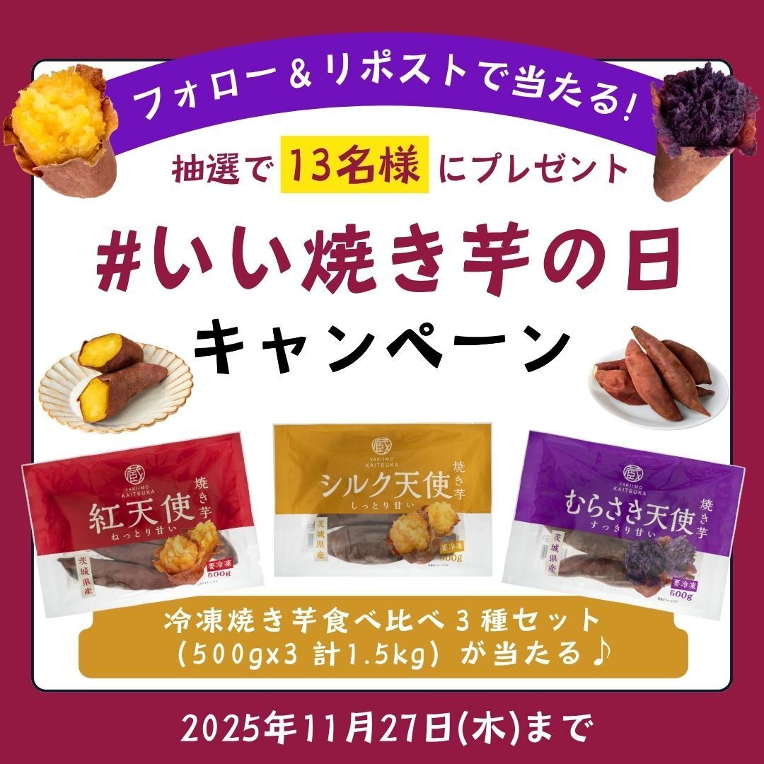 \11月13日はいい焼き芋の日🍠/ 蔵出し焼き芋かいつかで自慢の 紅天使❤️ シルク天使 💛 むらさき天使💜 冷凍焼き芋3種食べ比べセットを抽選で 13名様にプレゼント✨ 🍠応募方法🍠 ①アカウント( @calbeekaitsuka )を  フォロー ②この投稿をリポスト 好きな商品名を答えて当選確率アップ⤴