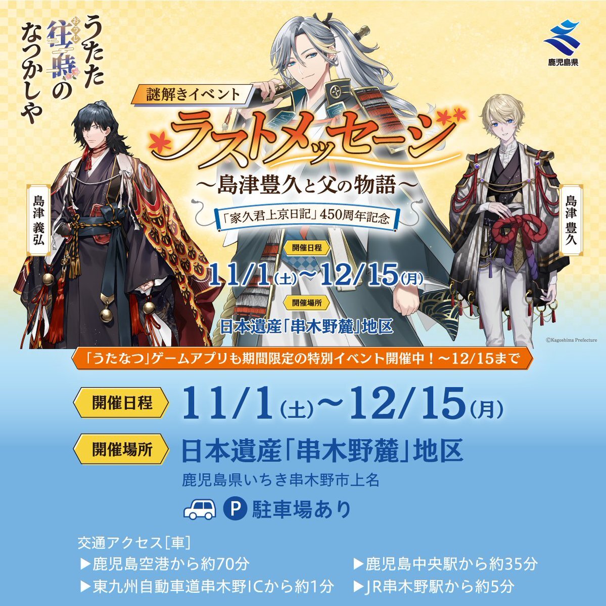 【謎解きイベント開催中!】 日本遺産「串木野麓」で11月1日から開催中です。 参加特典(先着500名)として、オリジナルクリアファイルや豪華宿泊券や特産品セットなどのプレゼント企画をご用意していますので、ぜひ遊びに来てください。 #謎解き #うたなつ #うたた往時のなつかしや