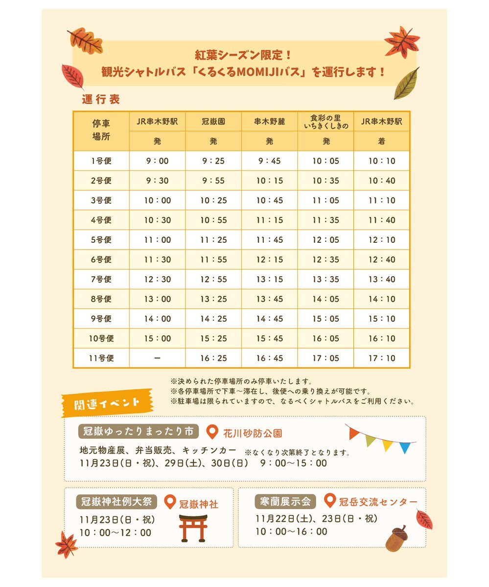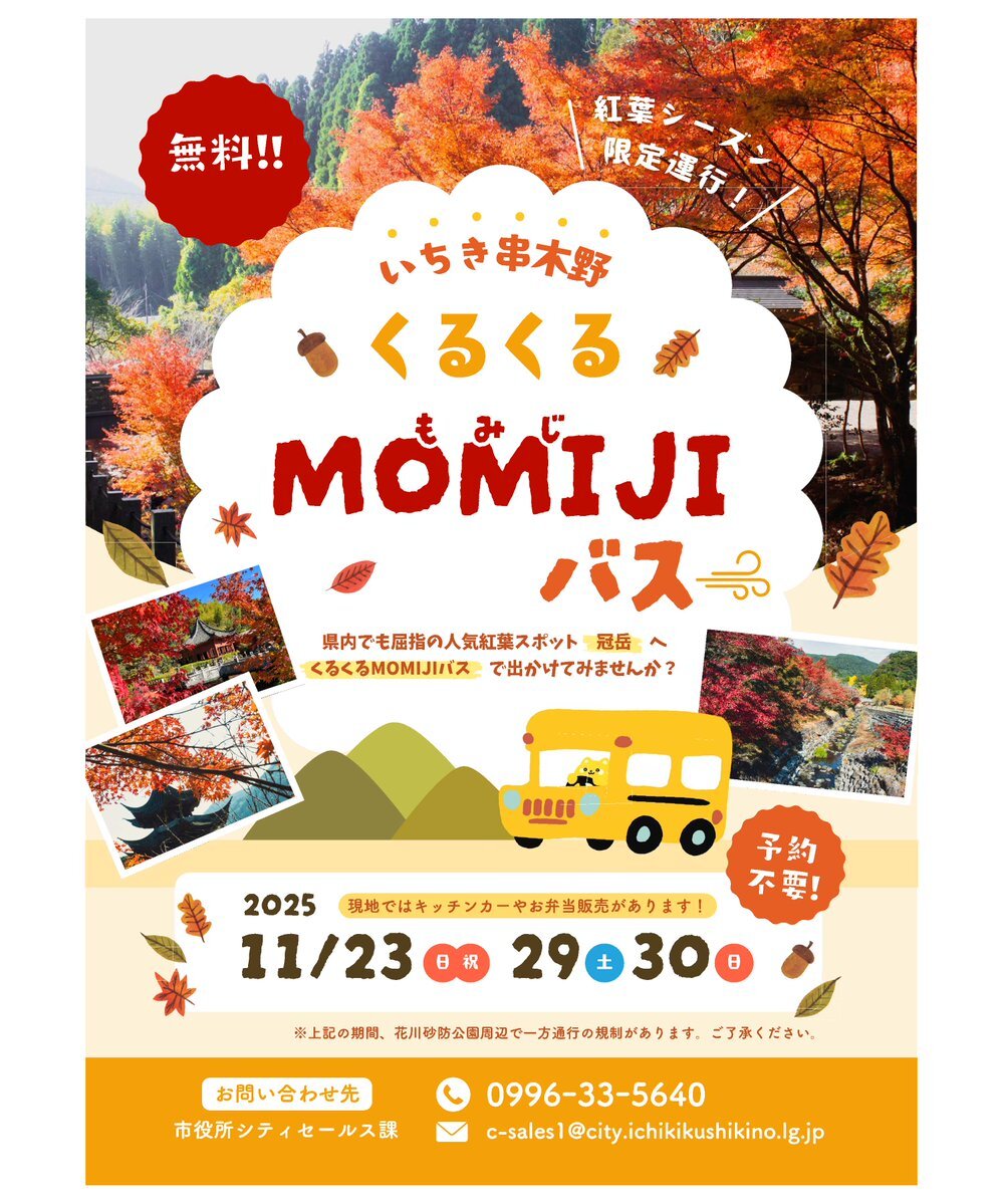 【お知らせ】 串木野麓もルートに入るJR串木野駅と冠嶽を結ぶシャトルバス「くるくるMOMIJIバス」が11月23日、29日、30日の計3日間運行します🚎 謎解きにお越しの方は、この機会にぜひご利用ください。 予約不要・運賃無料です。 #謎解き #いちき串木野市 #うたなつ #うたた往時のなつかしや pic.x.com/sp6oK4dY4p
