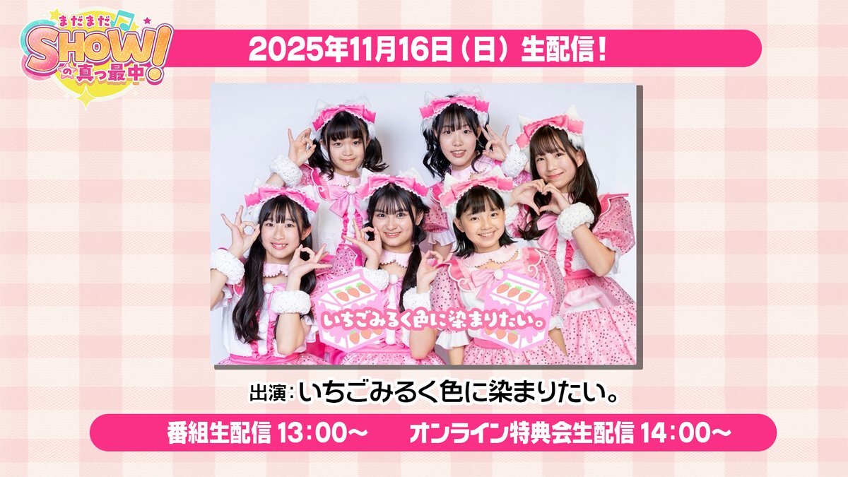 おはよー! 本日まだまだSHOWの真っ最中! 配信→オンライン特典会からの 五反田G7にてライブ! 盛り沢山な1日頑張るぞお✊🏻💫 みんな1日よろしくね! ライブのひめソロは"わたしの"がヒント! 一緒に楽しもうね〜 またあとで! x.com/ichigomilk_iro…