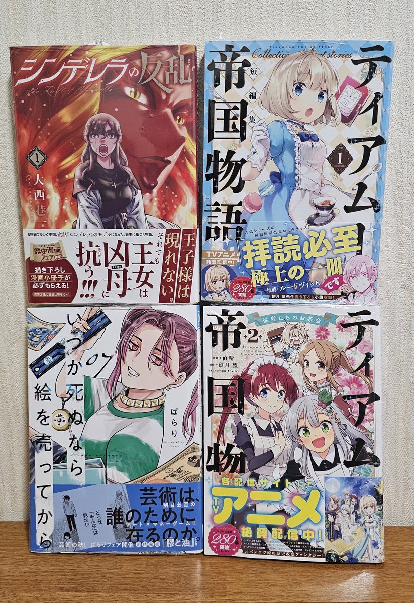 #今日買った漫画 #いつか死ぬなら絵を売ってから 7巻 #ティアムーン帝国物語 ~従者たちのお茶会~ 2巻 #ティアムーン帝国物語短編集 1巻 #シンデレラの反乱 1巻 #異世界転生 #異世界 #マンガ pic.x.com/UklLoHZBMp