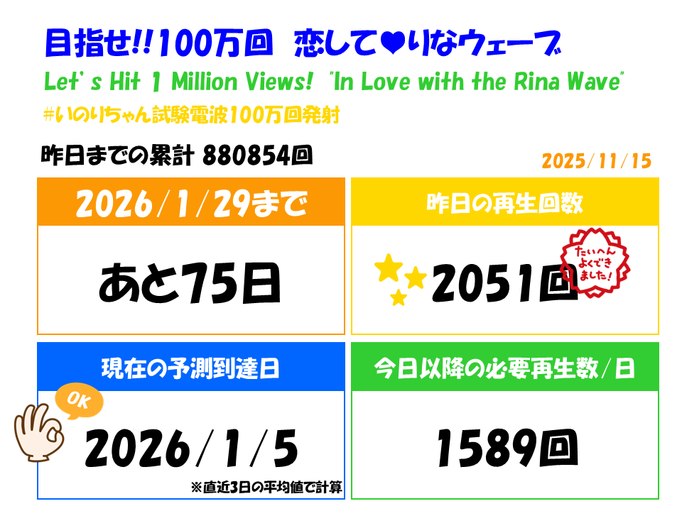 3日間の平均が2000回を超えたので到達日は大幅な前倒し。このペースならなんと!12/21のミーグリ最終日に間に合うかもしれません。 チャレンジの価値ありますね。 これまでの推移をリプ欄に貼っておきます。 youtu.be/NteYAaiUXzE?si… #恋してりなウェーブ #いのりちゃん試験電波100万回発射 pic.x.com/NX92fVD07U x.com/Monsieur_shinc…