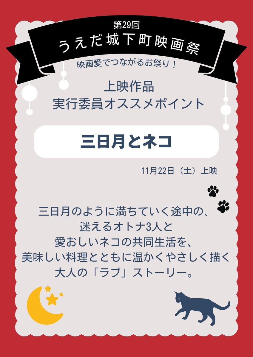 【第29回 #うえだ城下町映画祭】 今年上映する8作品について、実行委員オススメポイントをご紹介!💡④ 『三日月とネコ』 監督:上村菜帆 11/22(土)12:45~15:21 会場:上田映劇 大人のラブストーリー❤️ネコ好きの方も必見です🐱✨ #三日月とネコ pic.x.com/NYkASO8kt5