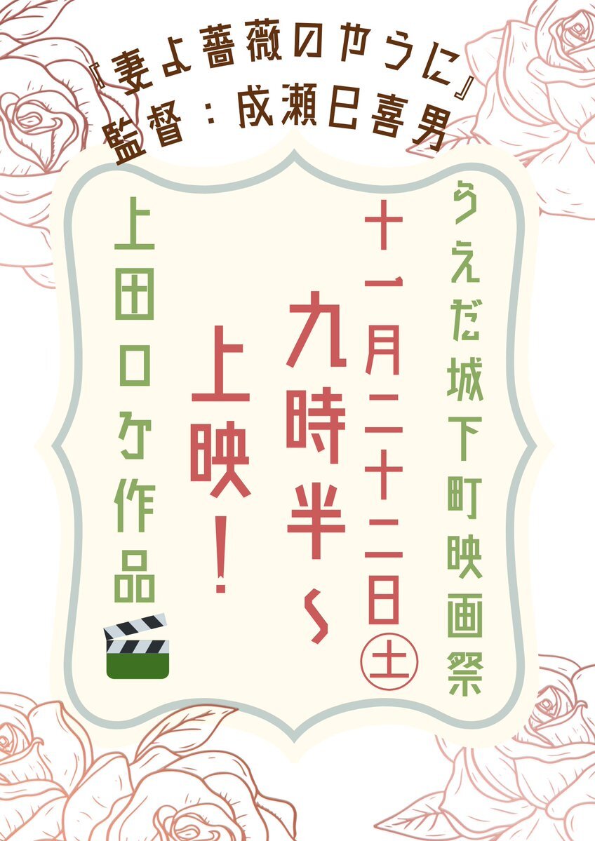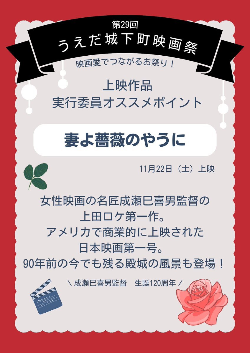 第29回うえだ城下町映画祭🎥✨ 11月22日(土)上映作品『#妻よ薔薇のやうに』 上田ロケ作品🎬 成瀬巳喜男監督生誕120周年🌹🎬 umic.jp/eigasai/index.… #うえだ城下町映画祭 #上田映劇 #上田市 @castletownFF pic.x.com/DXlmWT5W7N