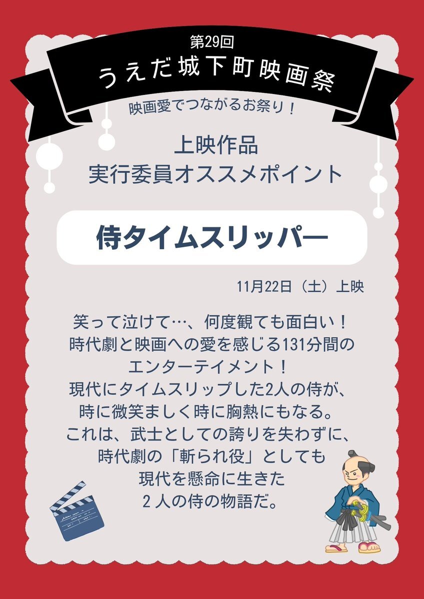 【第29回 #うえだ城下町映画祭】 今年上映する8作品について、実行委員オススメポイントをご紹介!💡⑤ 『侍タイムスリッパー』 監督:安田淳一 11/22(土)15:40~18:35 会場:上田映劇 自主制作から人気に火が付いた大ヒット作品!🔥 #侍タイムスリッパー pic.x.com/Ek4sgYxlpV
