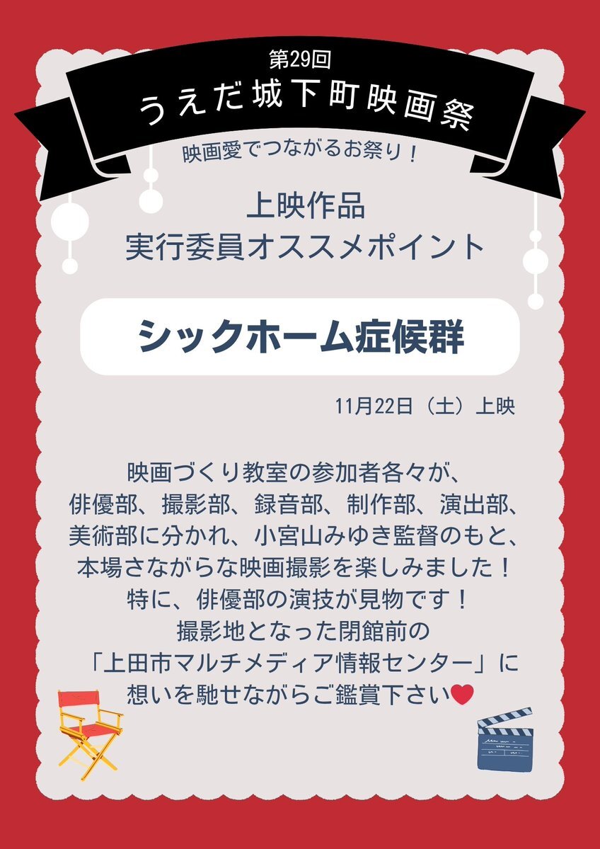 【第29回 #うえだ城下町映画祭】 今年上映する8作品について、実行委員オススメポイントをご紹介!💡③ 『シックホーム症候群』 監督:小宮山みゆき 11/22(土)11:05~12:00 会場:上田映劇 入場無料 懐かしい場所から離れ難い人たちを描く、第2回映画づくり教室作品。 #シックホーム症候群 pic.x.com/9AjwIyjsdK
