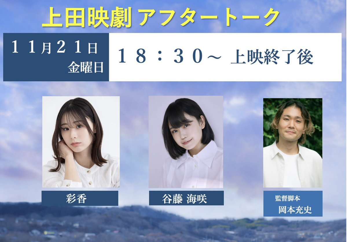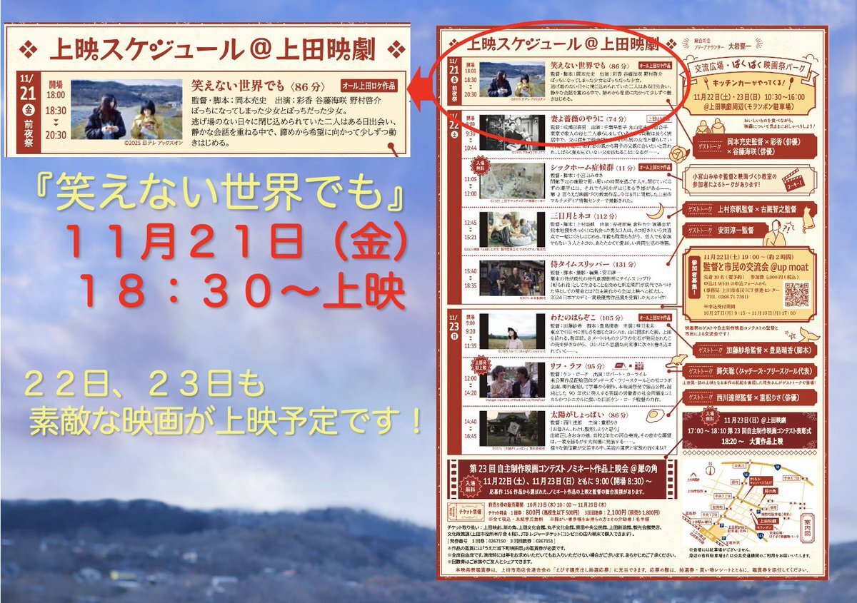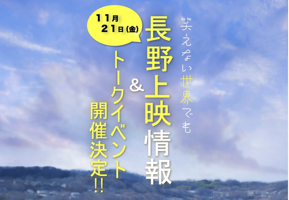 #笑えない世界でも 次は11月21日(金) 長野県 #上田映劇 さまでの #うえだ城下町映画祭 にお邪魔させて頂きます! 上映終了後にトークイベントも実施させて頂きます! ※チケットはなんと800円! ・11月21日(金)18:30〜の回 上映終了後 【登壇者(予定)】: #彩香 #谷藤海咲 #岡本充史 (監督) pic.x.com/VhalAUCVSY