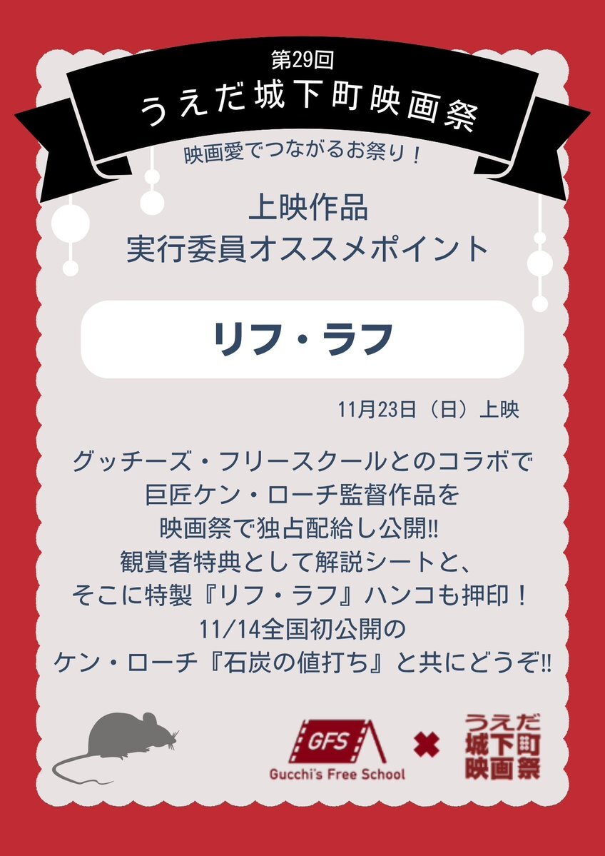 うえだ城下町映画祭上映作品🎬 『#リフラフ🐀』 未公開作品配給団体グッチーズ・フリースクールとの初コラボ企画🎬 ゲストに配給を実現したグッチーズ・フリースクール代表の降矢聡さんをお招きします✨ 🕛11月23日(日) 12:00~14:20 🎥上田映劇にて #うえだ城下町映画祭 #上田市 #上田映劇 pic.x.com/gGoCynJp6m