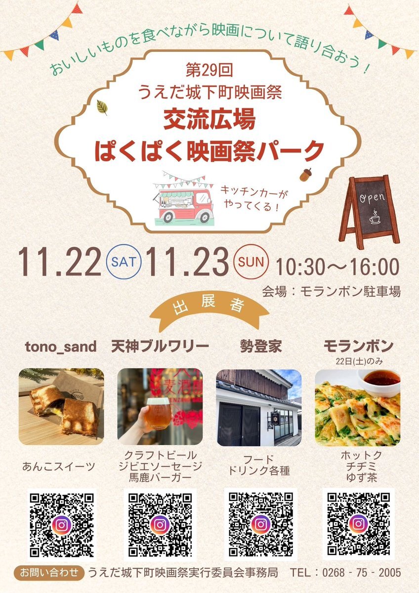 #うえだ城下町映画祭 では交流広場・ぱくぱく映画祭パークを設けます😋 映画を観てから映画について語り合うと、より楽しめる場になると思います💙 あの映画のここがよかった🙂あのシーンはどうやって撮ったんだろう🤔などぜひ語り合ってください😃 映画祭で素敵なひと時をお過ごしください☺️ pic.x.com/oAVIwcJEkM