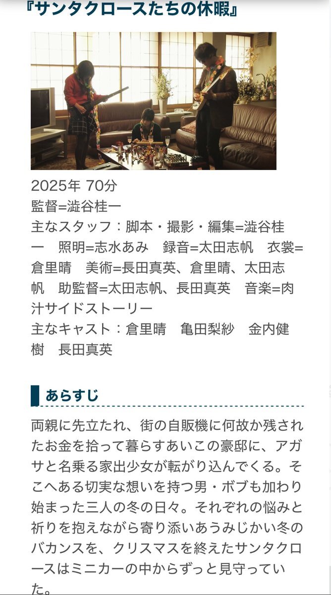 #うえだ城下町映画祭 にて共同企画&出演してる入選2作の上映が!楽しみだ! 🫧『ワンダリング・メモリア』 (監督:金内健樹) 11/22土曜9:05〜 🎄『サンタクロースたちの休暇』(監督:澁谷桂一) 11/23日曜9:00〜 at犀の角(長野/上田駅) 朝から楽しめる映画だと思います!心からおすすめです!是非!! pic.x.com/AhKjA2W8Ki x.com/castletownff/s…