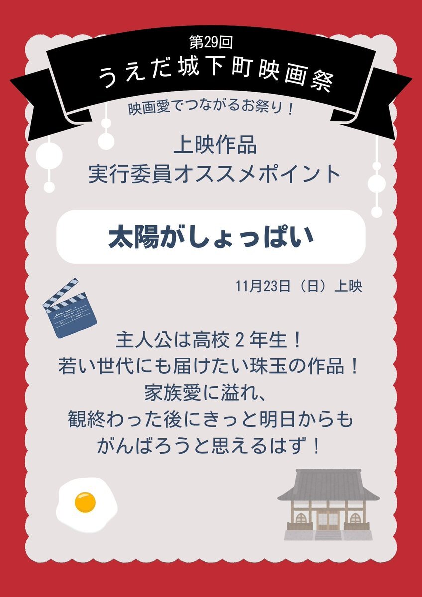 オススメポイントありがとうございます😊 23日(日)14時40分から上映です。 #うえだ城下町映画祭 #太陽がしょっぱい x.com/castletownff/s…