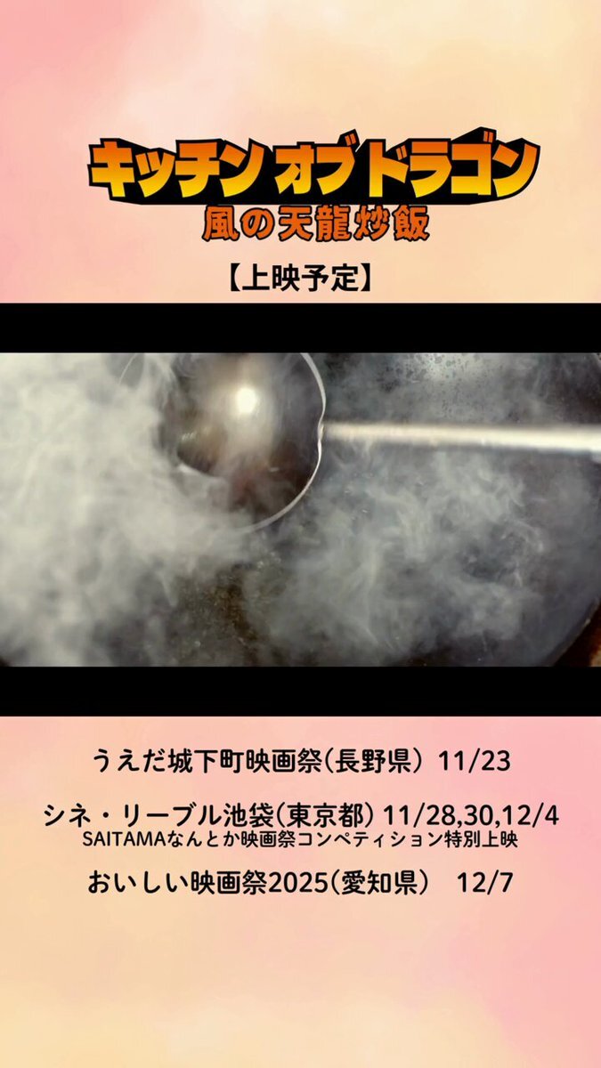 『#キッチンオブドラゴン 風の天龍炒飯』 【上映予定】 #うえだ城下町映画祭 (長野県) 11月23日 #シネ・リーブル池袋 (東京都)11月28日、30日、12月4日 (#SAITAMAなんとか映画祭コンペティション特別上映) #おいしい映画祭2025 (愛知県) 12月7日