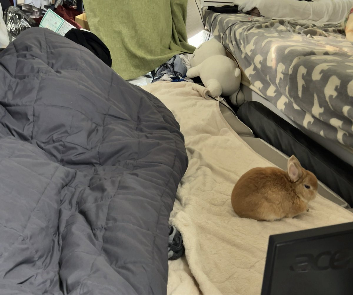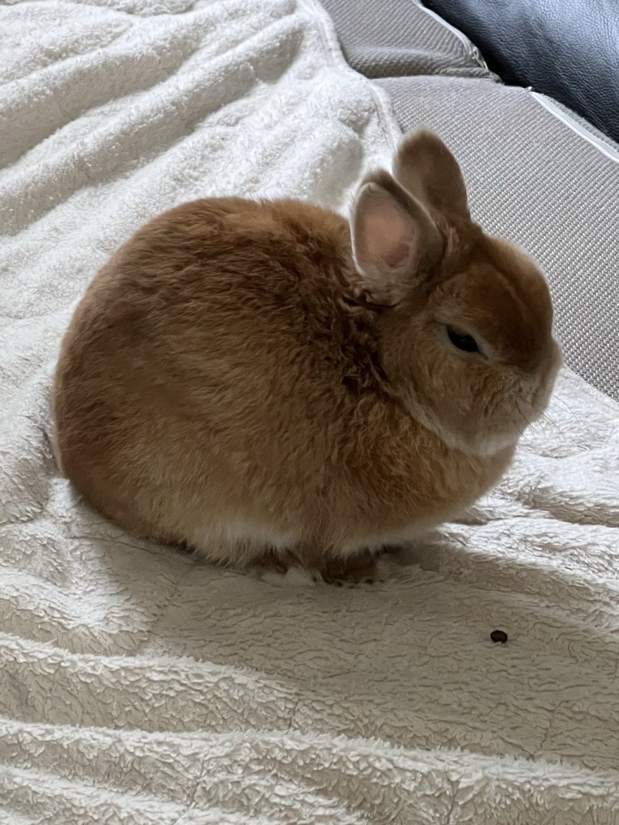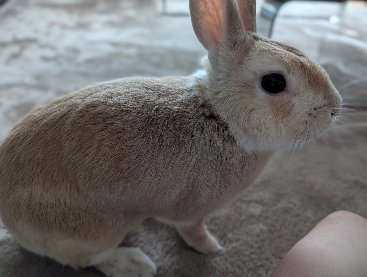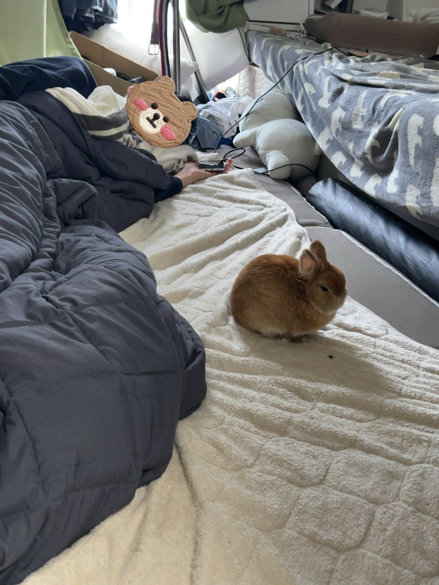 朝のウサギ:今日も30分以上おくつろぎで、飼い主ベッドに戻れず withウンコ (そばにある黒い点が、ウサギのウンコです) #うさぎのいる暮らし pic.x.com/oQeLueqJ5Z x.com/usagi_mpoppy/s…