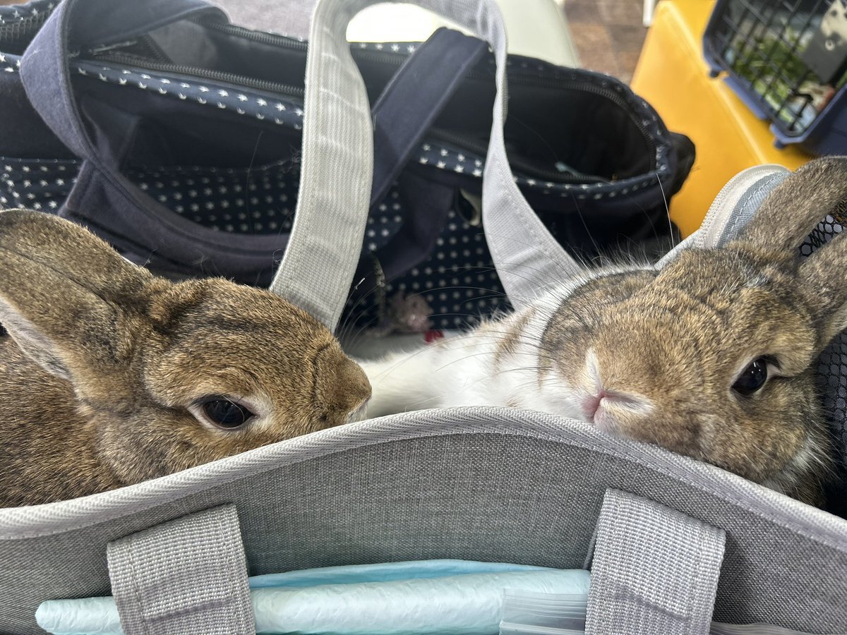 ☘️昨日の病院🏥での待合室にて☘️ まろん🐰(右)がビビってたから? まろん🐰💦のキャリーに移動したちょこ🐰慰めてました😅💦 でも、待合室にはわんちゃん🐶とかも居たので覗き込んで見てました👀笑 #わしゃわしゃ隊 #うさぎのまろん #うさぎのちょこ #うさぎのいる暮らし pic.x.com/y8S7nZmGzp