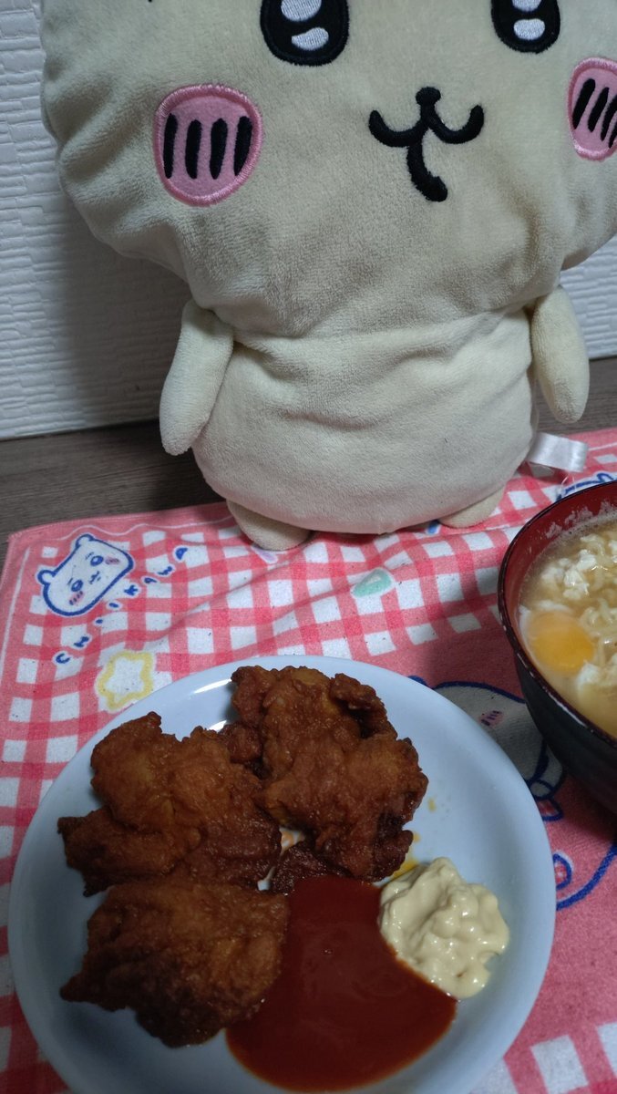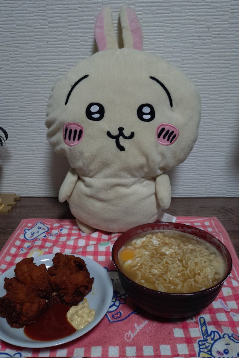 今日の夜うさ飯は マルちゃんのみそラーメンと 激辛唐揚げです😚 仕事から帰ってきて寝ちゃって 変な時間になりました😂 小ちいかわ達はもう寝てます☺️ なのでBOSSうさぎちゃんと一緒に いただきます😋 #うさぎ好きさんと繋がりたい pic.x.com/jUcvEGQjEJ