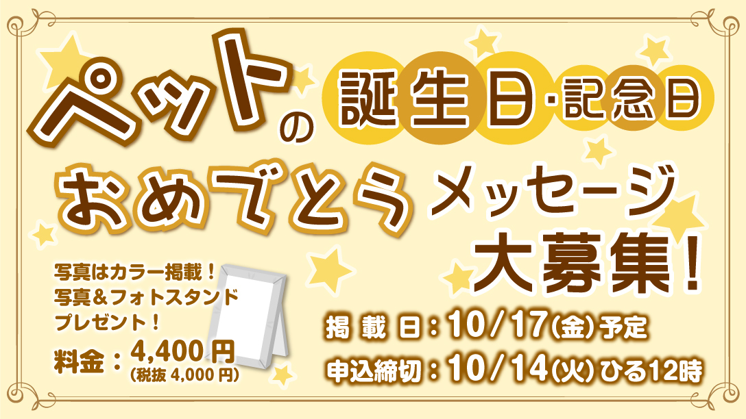 🍁🎃 ペット誕生日メッセージ、締切間近!✨ 10月のペットちゃんのお祝いメッセージ、まだ間に合うよ〜! ハロウィンや紅葉など、秋の思い出と一緒に愛情を込めよう🍂 締切は10/14(火)ひる12時です!お忘れなく! edi-s.co.jp/adpost/applyMe… #ペットの誕生日 #うちの子記念日 #10月 #秋の思い出 pic.x.com/TAyurpaUWc