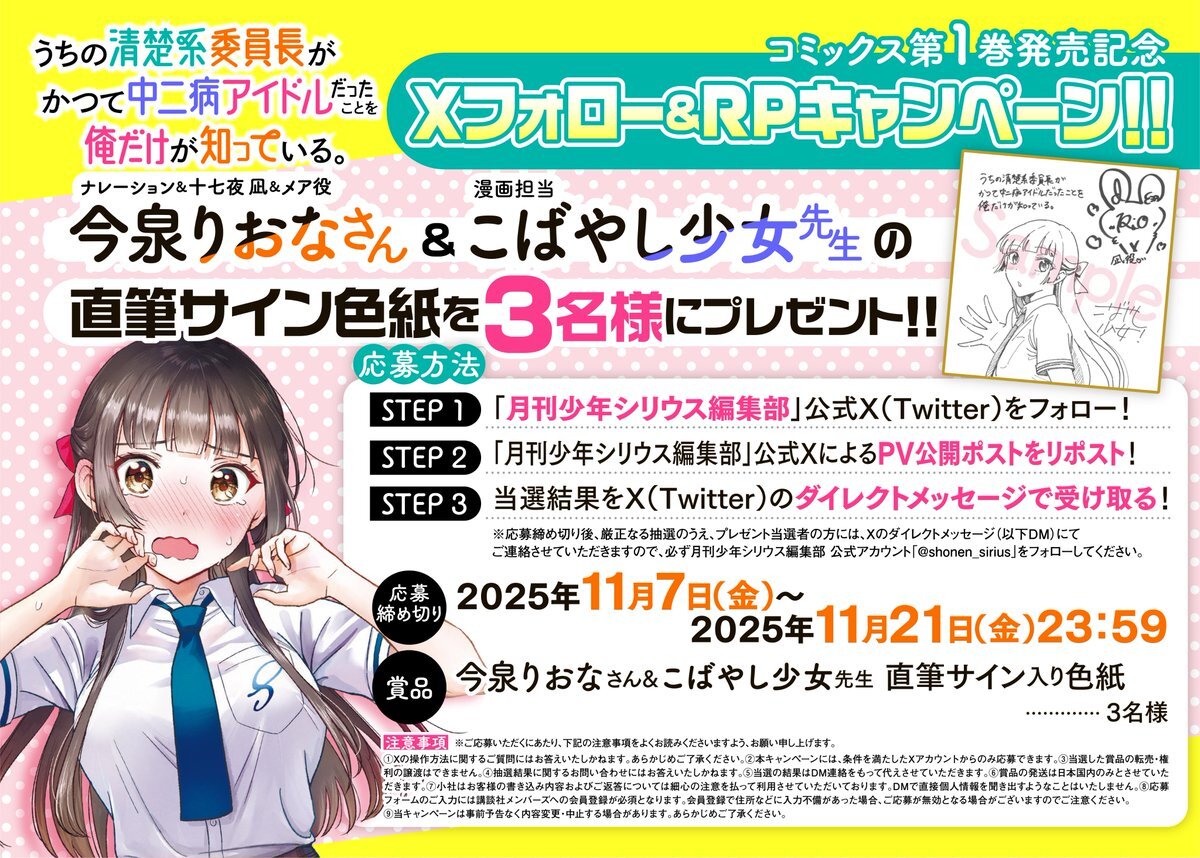 \\㊗️PV公開🎉RPキャンペーン// 『うちの清楚系委員長がかつて中二病アイドルだったことを俺だけが知っている。』1巻発売を記念し、 今泉りおなさん&こばやし少女先生の 直筆サイン色紙を3名様にプレゼント!🎁 【応募方法】 【1】@shonen_siriusをフォロー! 【2】引用元のPV公開ポストをRP! x.com/shonen_sirius/…
