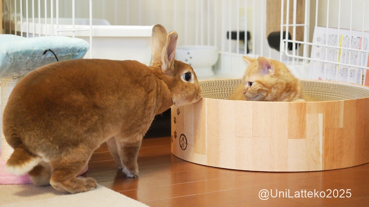 【ビビリ猫ラテ vs 動じないうに先輩】 何かを企てていたラテですが、突然の逃走!😂 🐰うに先輩「今の何?🤔」 #うにラテ成長記録 #猫かわいいね pic.x.com/KLKgYZ0myA