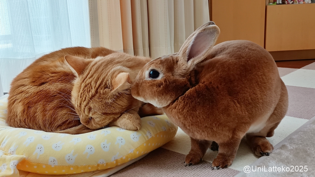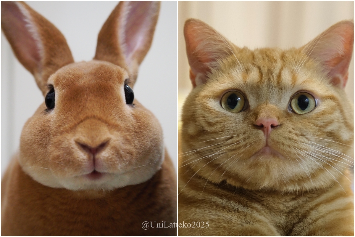 【うにラテ自己紹介】 うに🐰ミニレッキス(5歳) おにぎりフェイスのモチモチボディ。怒ると「ブヒッ!」少し怖い。家では「ボクが一番」と思っている。 ラテ🐱立ち耳スコ(3歳) まんまるフェイス。ビビリで子猫のような声の甘えん坊。ママ👩‍🦰が大好きなくっつき虫。 #うにラテ成長記録 pic.x.com/V04UTScVJg
