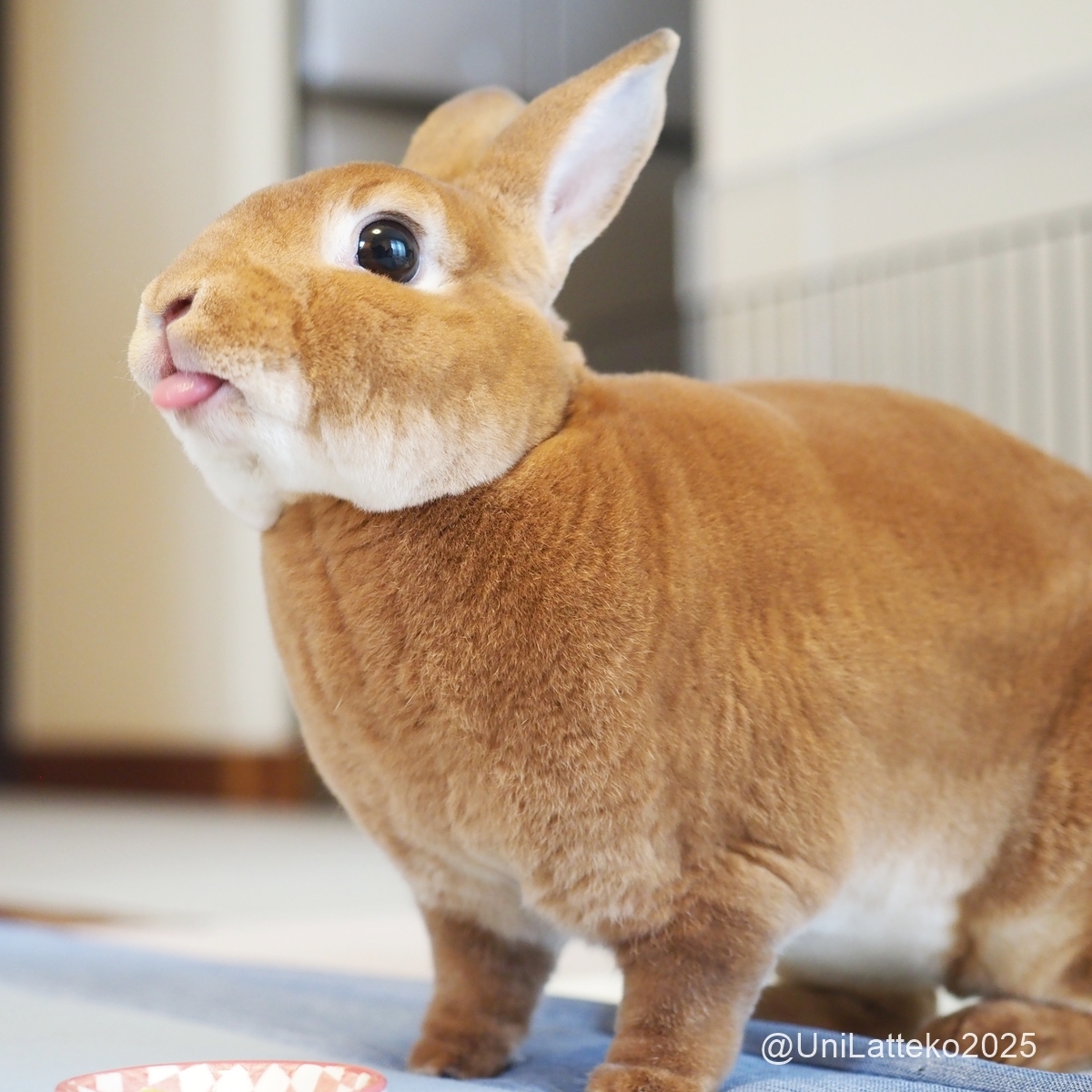 おやつおいしい🥰…って顔のうにくん。 ペロっと出た舌と、きゅるんとしたお目々がたまらない。✨ #うにラテ成長記録 #ミニレッキス #うさぎのいる暮らし pic.x.com/XzQgAGXdlM