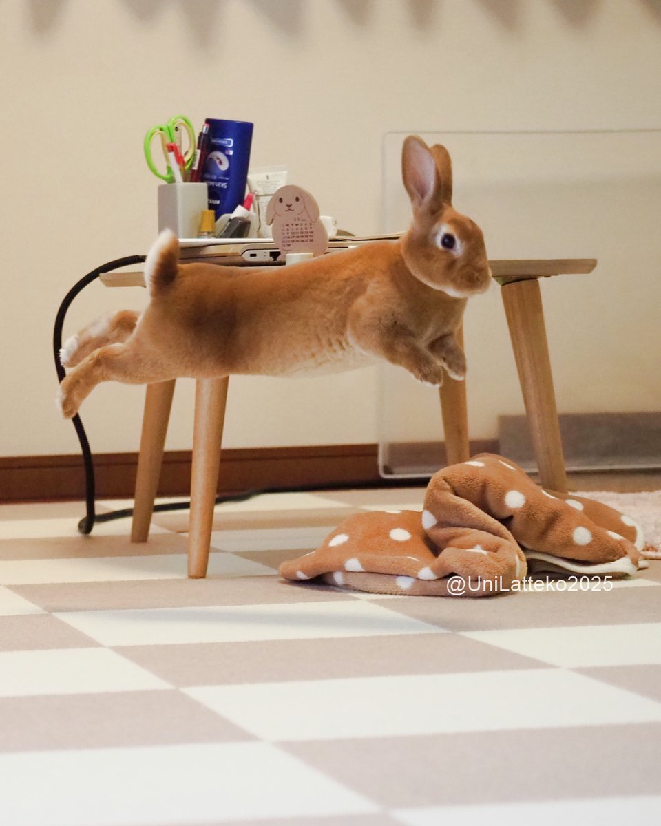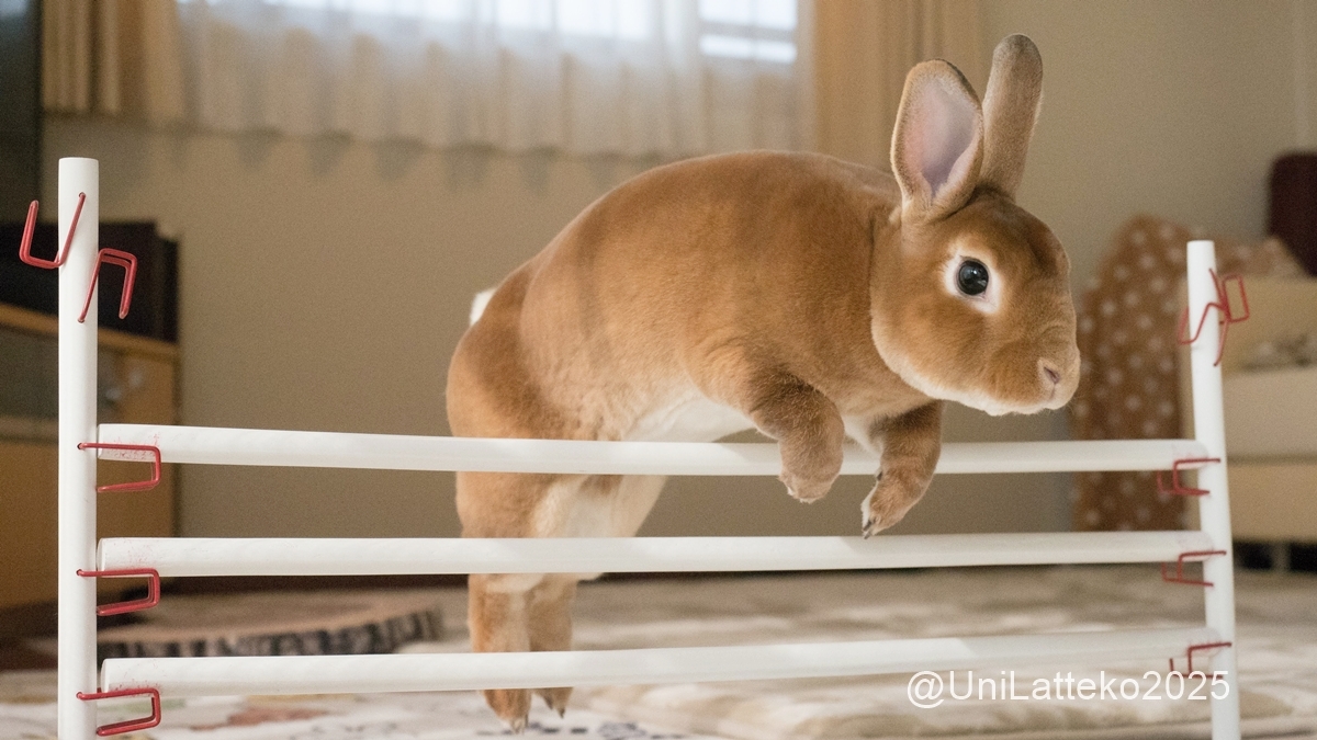 真顔で跳ぶうに選手💨 もちもちボディが宙を舞う、空飛ぶおにぎり🍙 美しいフォームに注目です✨ #うにラテ成長記録 #ミニレッキス #うさぎのいる暮らし pic.x.com/uMoOwHUNab