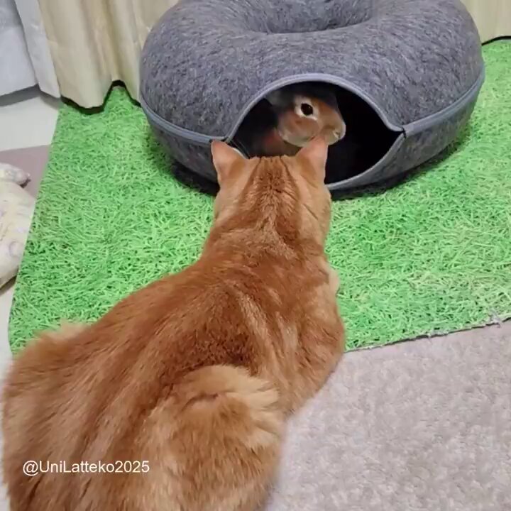 翌日も懲りずに待ち伏せする🐱ラテ。 中にいる🐰を見た瞬間にビビって逃走。 何がしたかったのかな🤔 #うにラテ成長記録 #猫のいる暮らし pic.x.com/ClDZDckOzm x.com/UniLatteko2025…