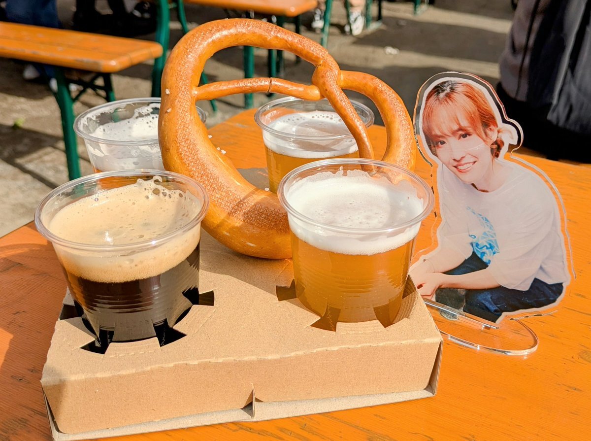 青山公園 #ドイツフェスティバル2025 に来ています。料理は長蛇の列なので早々にあきらめて、ブレッツェルとビール4種飲み比べでランチです。 #綿谷エリナ さん、@FM_BIRD さん、アクスタの使い方、これでよろしいでしょうか? #えりぃ pic.x.com/LEpDjyHlcC