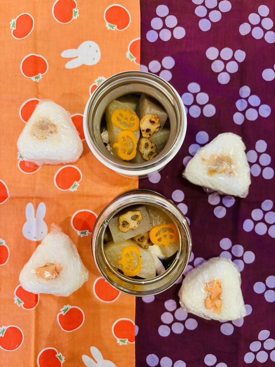 2025/10/31 今日のJCJK弁当🎀 ・おでん🍢  大根、鶏の手羽元、卵、こんにゃく、  ちくわ、じゃがいも ・おにぎり🍙  焼き明太子、鮭 おいしい風呂敷『トマト』『ぶどう』 #お弁当 #お弁当日記 #お弁当作り楽しもう部 #おいしい風呂敷 pic.x.com/pafWZ7xFm9