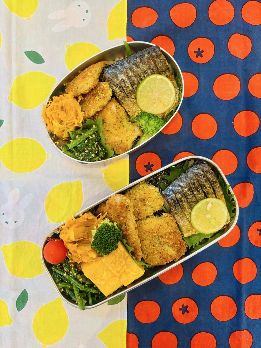 2025/10/16 今日のJCJK弁当🎀 ・鯖の塩焼き ・鶏の香草パン粉焼き ・かぼちゃサラダ ・卵焼き ・ほうれん草の胡麻和え ・🥦🍅 おいしい風呂敷『レモン』『ミニトマト』 #お弁当 #お弁当日記 #お弁当作り楽しもう部 #おいしい風呂敷 pic.x.com/i9qyOerjYH