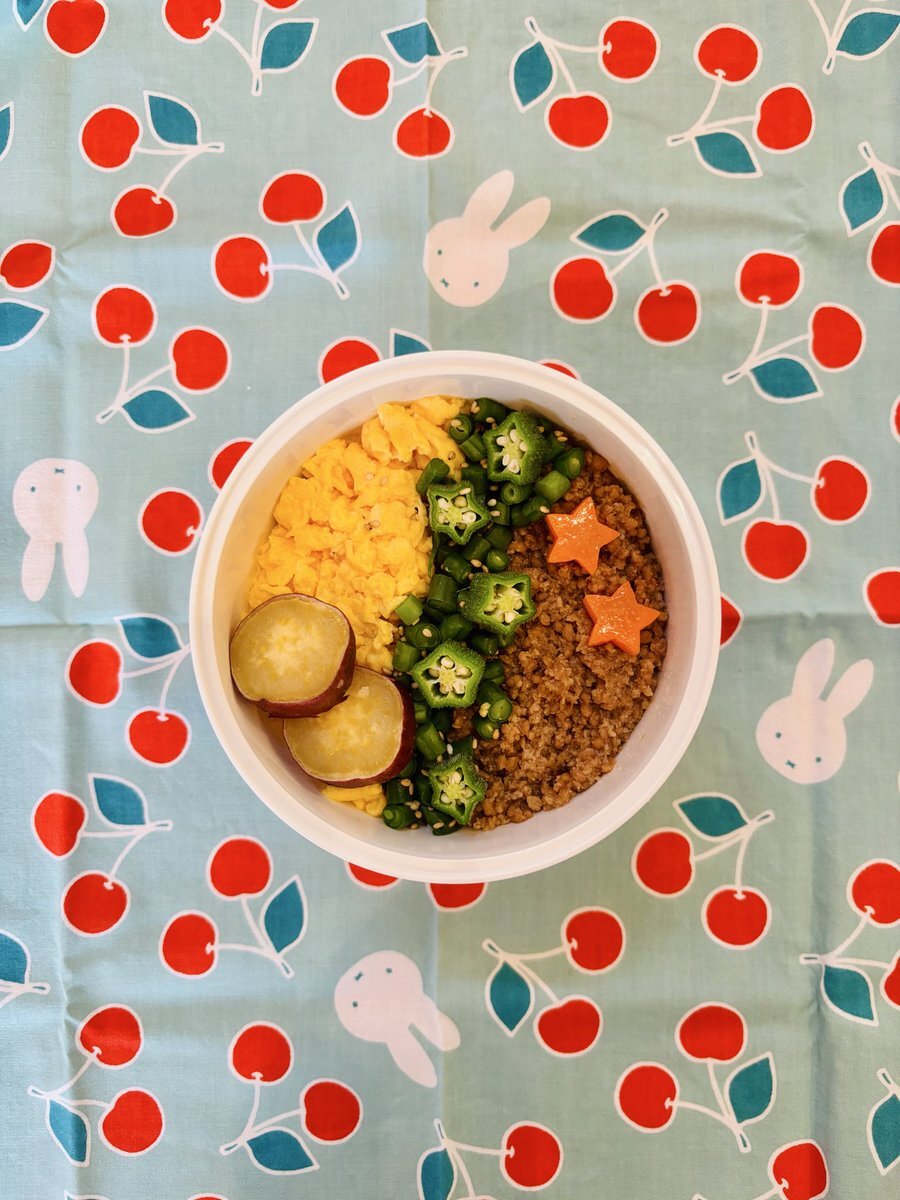 2025/10/21 今日のJCJK弁当🎀 ・三色丼(鶏そぼろ、炒り卵、いんげん、オクラ) ・にんじんとサツマイモのバターソテー おいしい風呂敷『さくらんぼ』 #お弁当 #お弁当日記 #お弁当作り楽しもう部 #おいしい風呂敷 pic.x.com/kqEZ6kOft4