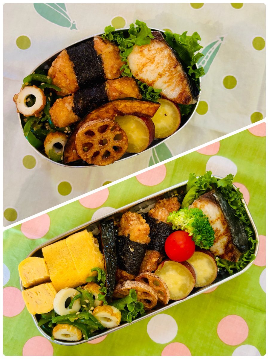 2025/10/22 今日のJCJK弁当🎀 ・鰆の塩麹柚子胡椒風味 ・のり巻きチキン ・蓮根と南瓜の素揚げ ・ピーマンとちくわの甘辛炒め ・サツマイモバター ・卵焼き ・🥦🍅 おいしい風呂敷『まめ』『だんご』 #お弁当 #お弁当日記 #お弁当作り楽しもう部 #おいしい風呂敷 pic.x.com/BgPzWXb1EC