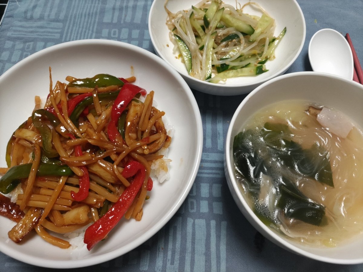 【のぞみん亭の献立 10/19】 ☆晩ご飯 ピーマン、竹輪で青椒肉絲丼 キュウリとモヤシのナムル 春雨スープ #料理好きな人と繋がりたい #おうちごはん𓎩𓌉𓇋 #おうち中華 pic.x.com/geklYQEvgR