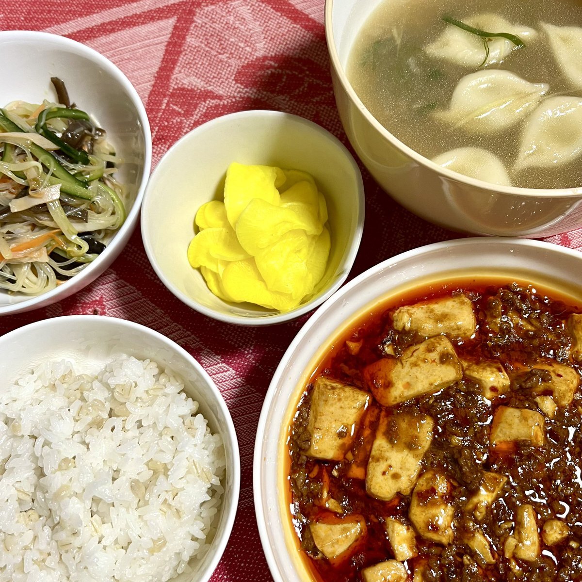 オタクキタク( ´ ▽ ` ) 平日、病院が多いので 日曜日は普通に働きます😅 晩ご飯の支度٩( 'ω' )و 今日は"おうち中華" 【麻婆豆腐】【中華風春雨サラダ】【水餃子】 #おうちごはん #おうち中華 #麻婆豆腐 pic.x.com/C1ZbIosx5y