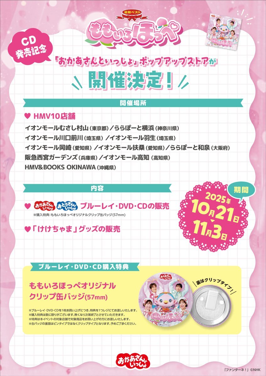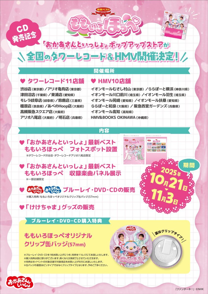 #おかあさんといっしょ】 🍑🎊🍑🎊🍑 最新ベスト「#ももいろほっぺ」 発売記念ポップアップストア開催決定!!! 🍑🎊🍑🎊🍑 10/21(火)~11/3(祝・月) の期間限定です✨ 是非この機会にご来店ください🚗💨 ご予約もまだまだ受付中⭕️ お待ちしております!! ⬇️⬇️⬇️ pic.x.com/tdumJB9tbq x.com/mama_ponycanyo…