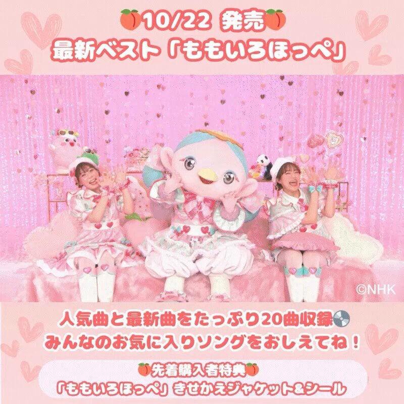 🍑🍑10/22(水) 発売🍑🍑 発売日まであと1週間📝 #おかあさんといっしょ 最新ベスト #ももいろほっぺ ご予約受付中🫶 「ファンターネ!」のみもも、まやお姉さん、杏月お姉さんがキュートに歌う話題の「ももいろほっぺ」と人気曲を全20曲収録👀 お気に入りの一曲をぜひ教えてくださいね🎶