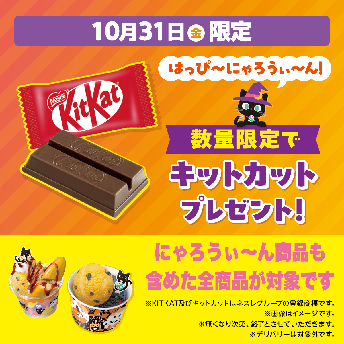 / 仮装テンプレート使ってもらえたかにゃ?🐈⬛🎃 \ 10月31日(金)にサーティワンで商品を購入すると数量限定で「キットカット」をプレゼント🍫✨ (なくなり次第終了🙇♀️) 仮装したら #おかしにゃおかしにゃにゃろうぃ~ん で見せてね🎃 テンプレートは引用元の投稿から👀✨ お店でまってるにゃ🐾 pic.x.com/Kr74wtM30b x.com/BR31_Icecream/…
