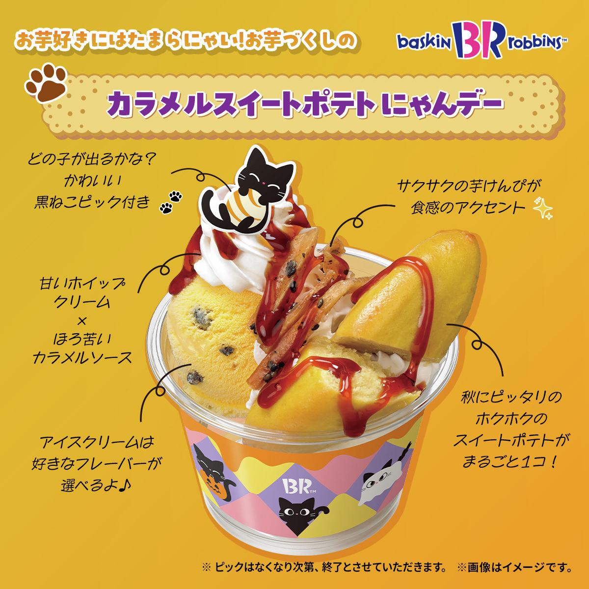 / お芋好きに届けー🍠✨ \ サーティワンのハロウィン🎃🍬 #おかしにゃおかしにゃにゃろうぃ~ん 開催中🐈⬛🌕✨ サックサクの芋けんぴに、ホクホクのスイートポテト🍠✨ とろ~りビターなカラメルソースを合わせた、秋にぴったりの限定サンデー🍨 みんな食べてみてね🐾🍠 10月31日(金)まで🎉 pic.x.com/J2vufYMRLe