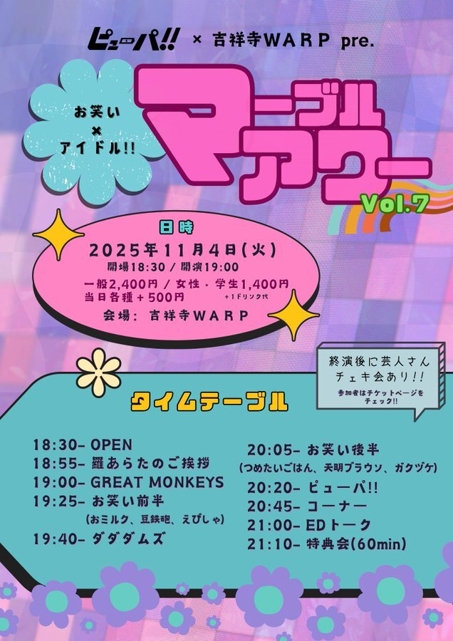 ⊃本日!⊃ ピューパ!!さん主催のマーブルアワー!! 「ピューパ!!×吉祥寺WARP pre.マーブルアワーVol.7」 2025.11/4(火) 吉祥寺WARP OPEN 18:30/START 19:00 前売 ¥2400/当日 ¥2900/女性・学生前売 ¥1400/女性・学生当日 ¥1900 各1D代別 tiget.net/events/435406