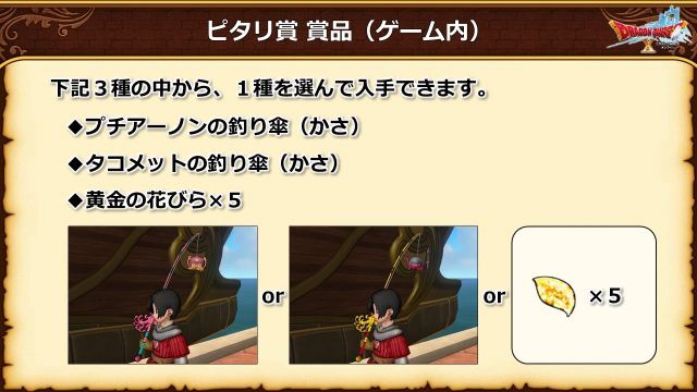 【おしらせ】今回から、ピタリ賞のさかなを釣って「釣り師範ナツリ」に見せると、3種類の中から1種選んでもらえるように変更しました。 「プチアーノンの釣り傘」「タコメットの釣り傘」「黄金の花びら×5」から好きなものを選んで獲得できます! #DQ10 #おっとっと #DQXTV (2/3) pic.x.com/V8lOWHdzKU