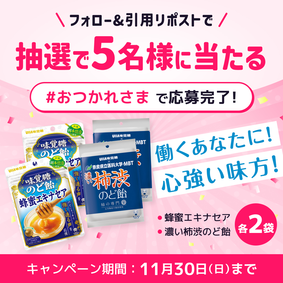 \明日は 勤労感謝の日💼/ 毎日働くだれかに、そして自分自身に 感謝の気持ちを込めて✨ 🎉プレゼントキャンペーン開催!🎉 ・味覚糖のど飴 蜂蜜エキナセア✖2 ・濃い柿渋のど飴✖2 毎日の体調ケアにうれしいのど飴セット 5名様にお届けします🍬 👇応募方法 ①このアカウントをフォロー ②
